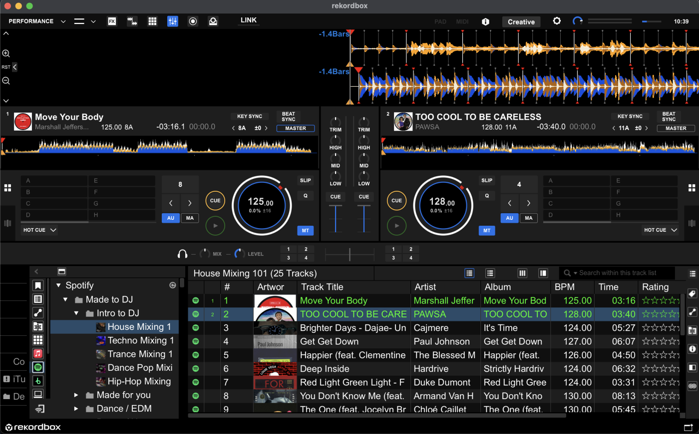 Hoy en día, la situación es, por supuesto, incomparablemente diferente, y pinchar con servicios de streaming lleva las cosas un paso más allá. En lugar de escuchar fragmentos de música y crear cajas digitales para descargar mientras poco a poco descubres tus géneros preferidos, ahora los DJs pueden lanzarse directamente y empezar a mezclar. Los servicios de streaming están integrados en rekordbox y en reproductores compatibles de tal manera que te permiten hacer precisamente eso. Desde las listas de géneros de Beatport hasta las listas de reproducción personalizadas de Spotify, un DJ novel podría literalmente probar a mezclar 10 géneros diferentes en su primera sesión.